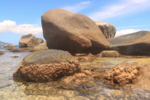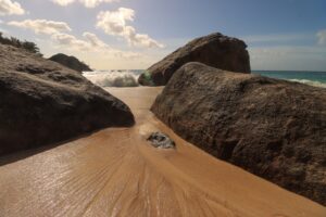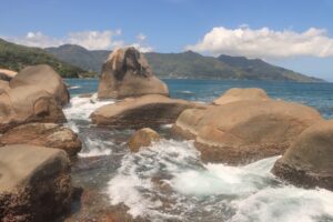 Direkt am hiesigen Strand fand ich ich auch einen „eigenen“ Kletterpark in den hier besonders zahlreichen Granitfelsen. Was war das schön dort herumzukraxeln…, niemand sonst kam auf diese Idee und ich genoss diese Morgenstunden in der tosenden Brandung in absoluter Einsamkeit. Dort fand ich tolle Fotomotive auf und zwischen diesen steinernen Riesen. Diese stetige Brandung (welche auch nachts für eine kraftvolle Geräuschkulisse sorgte) nahm mir jedoch den Spaß am Schwimmen, weshalb ich sehr dankbar das Klettern annahm. Sogar das Schnorcheln war auch direkt vor der Tür machbar und sorgte für weitere Freudenmomente, schon wenige Meter vom Strand gab es felsige, von Korallen bewachsene fischreiche Stellen. Zum Schwimmen gab es dagegen im benachbarten Beau Vallon einen perfekten breiten und 1 1/2 Kilometer langen schneeweißen geschützteren Strand. Dorthin fuhren wir mehrmals nachmittags per Bus.