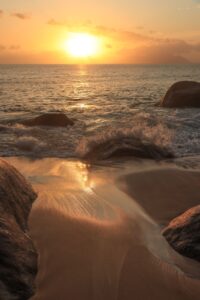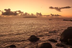 Das Licht auf La Digue ist gefühlt noch einmal spezieller, das Meer noch türkiser leuchtend und das Azurblau des Himmels noch intensiver, genauso empfanden wir das dort und konnten uns nur schwer von diesem von Kokospalmen geschmückten Strand trennen. Denn wir wollten unbedingt noch zum berühmten Strand Anse Source d’Argent im Süden der Insel. Dort verbrachten wir die restliche Zeit bis zur Abfahrt entspannt. Den Sonnenuntergang erlebten wir an diesem Tag kurz vor der Ankunft über Mahé.