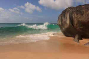 Die zweite Fahrt nutzen wir nach einem Bummel durch die Hauptstadt Victoria für eine Fahrt in den Inselnorden. Dort an der Machabee Bucht fanden wir eine versteckte, nur durch eine kleine Treppe erreichbare Badebucht mit der perfekten Seychellenkulisse. Eingerahmt von imposanten Granitriesen (ein weiteres Kletterparadies) und unter den schattenspendenden Kokospalmen erlebten wir den nächsten Glücksmoment. Ein Platz um die Zeit zu vergessen…, hier war der Wellengang noch heftiger und an Schwimmen gar nicht zu denken.