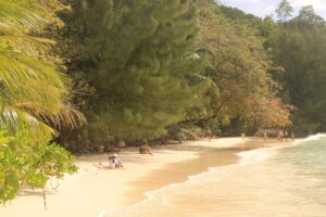 Den Nachmittag verbrachten wir dann an der Bucht von Port Launay, erneut einem wunderschönen langgezogenen Strand an einer geschützten Bucht, wo das Schwimmen auch gut möglich war. Hier gab es ein verstecktes Luxusresort, welches den größten Teil des Strandes füllte. Trotzdem ist der Strand wie auch überall auf den Inseln für alle zugänglich, weshalb wir uns dort auch niederlassen konnten und auch die Seychellois dort ihre Partys feiern können. Ein schöner Kompromiss zwischen Urlaubern und Einheimischen, der uns überall auf den Inseln auffiel. Auf dem Weg dorthin fuhren wir durch das von Mangroven gesäumte Wetland.