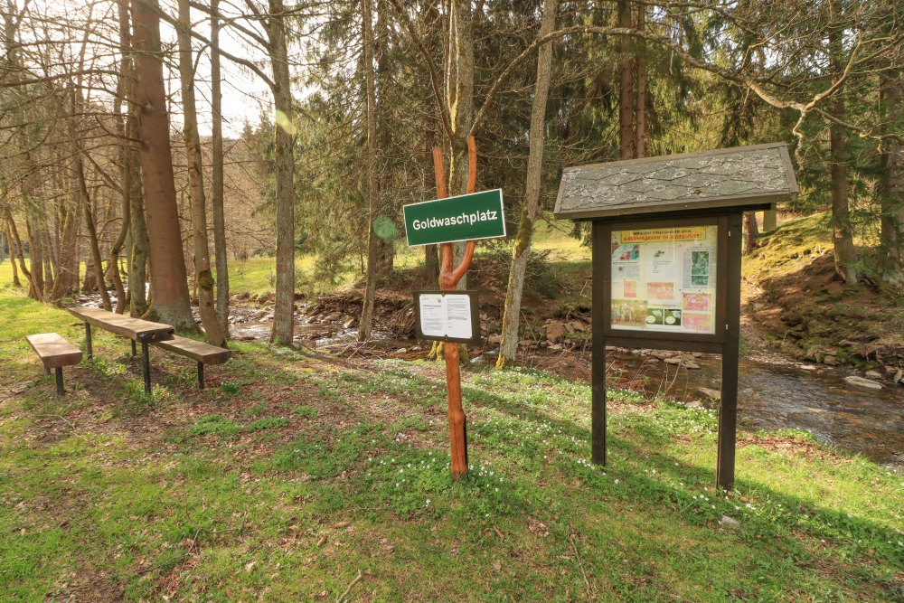 Frühling 2021 im Schwarzatal; Goldwaschplatz an der Schwarza oberhalb von Katzhütte
