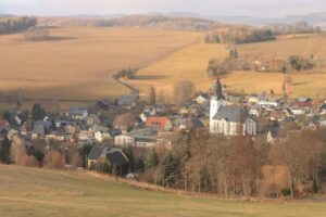 Nachdem ich die Stadt Wolkenstein mit dem hoch über dem Zschopautal gelegenen Schloss passiert hatte, folgte ich dem markierten Zschopautal-Radweg hinauf hoch in die Gebirgslandschaft bei Drebach. Dieser Anstieg hatte es in sich, hier waren Steigungen von 10 % zu meistern und das auf einem längeren Abschnitt. Dafür war das inzwischen etwas aufgeklarte Bergpanorama dort oben wirklich schön anzusehen. Bis nach oben bewegte ich mich relativ sicher auf der asphaltierten Landstraße, doch die Abfahrt führte über gepflasterte Radwege und gefrorene Waldwege. Dort passierte dann auch das fast Unvermeidliche, ich konnte mein Rad nicht mehr kontrollieren und fiel nach links auf den gefrorenen Acker neben der Fahrbahn. Mein Tempo vor dem Sturz war moderat und durch mein Steuern weg vom gepflasterten Radweg, fiel ich fast schmerzfrei auf die linke Seite in das Feld. Glück gehabt, dem Rad ist auch nichts passiert, so ging es vorsichtig weiter durch die Einsamkeit dort oben. Ich dachte wenn du hier irgendwo schwer verunglückst, findet dich so schnell kein Mensch… . So war ich voller Konzentration und Adrenalin, konnte keinen Gedanken an Pause oder gar Essen verschwenden, so ging es den ganzen Tag weiter bis zum Ziel.