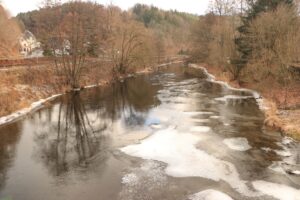 So radelte ich vorsichtig die Abfahrt hinunter nach Schlettau, wo ich direkt am Fluss dem Zschopautal-Radweg, wie geplant, flussabwärts folgte. Die ersten Kilometer bis Wolkenstein waren rückblickend wahrscheinlich die leichtesten und entspanntesten. Denn es ging hier meist auf Schotterwegen durch den Wald und kleine Ortschaften, direkt am oder über dem Fluss durch eine wilde Gebirgslandschaft. In der Gemeinde Tannenberg merkte ich auch gleich welch wichtige Rolle heute der Belag des Weges spielt, bei einem kurzen Fotostop konnte ich kaum mein Rad abstellen und lag dann auch schon längs auf dem Bürgersteig. Das fing ja gut an…, auf meinem Mountain-Bike fühlte ich mich sogar sicherer als zu Fuß. Straßen-oder Gehwegpflaster (ob alt oder glatt und neu) waren heute der gefährlichste Untergrund überhaupt! Erstaunt musste ich mehrmals feststellen, das die nagelneuen Reifen bei Anstiegen auf dem Eis über dem Pflaster einfach durchdrehten, das kannte ich noch nicht. Asphalt war da eindeutig die bessere Wahl.