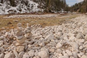 So ging es auf dem selben Weg wieder hinunter nach Scharnitz, unterwegs setzte ich noch eine kleine temporäre Markierung in das Flusstal. Wenn ich mit meiner Elke in den Bergen unterwegs bin, gibt es bei jeder Tour das Ritual des Baus einer Steinmandl-Gruppe oder eines Turmes aus dem vorhandenen Geröll. Das entwickelt sich dann oft zu einem Wettbewerb unter uns, wo wir alles um uns vergessen. Allein macht das natürlich weniger Spaß und ich beschränkte mich deshalb auf zwei kleine Steinmandl direkt an der Isar.