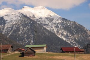 Zurück in Scharnitz, folgte ich zunächst dem Isar-Radweg hinab, bis in das hübsche Städtchen Mittenwald. Dabei gab es aus dem Tal auf dem ganzen Weg schöne Blicke hinauf in die direkt hinter der Isar aufragenden, schneebedeckten Gipfel des westlichen Karwendelgebirges. In Mittenwald gönnte ich mir am Obermarkt, einem ganz besonderem Ensemble mit typisch bayerischen Häusern voller farbenfroher Fassadenmalereien (Lüftlmalerei), die nächste Kaffeepause im schönsten Sonnenschein.