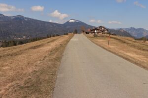 Anschließend verließ ich den Isar-Radweg für heute und begab mich hoch hinauf durch die Buckelwiesen in ein idyllisches Almland mit unglaublichem Panoramablick zwischen Karwendel, Wetterstein- und Estergebirge. Was für eine Kulisse, auf ca. 1000 Höhenmetern legte ich an der höchsten Stelle des Weges eine weitere Rast ein und schaute, schaute und schaute… .