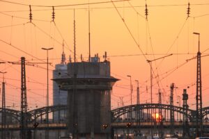Sonnenuntergang zum Abschluss dieses erlebnisreichen Tages beim Umstieg am Münchner Hauptbahnhof, Blick vom Bahnsteig zur Hackerbrücke