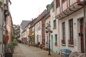 Weiter ging es in Richtung Krefeld dann auch teils auf straßenbegleitenden Radwegen und durch die Großstadt musste ich mich ein wenig quälen, fuhr ohne Halt (und mit einigen Umwegen) bis zum Uerdinger Rheinufer. Ich erreichte den Rhein schon 15.30 Uhr und konnte damit diese Tour wie geplant umsetzen. Uerdingen besitzt eine hübsche kleine Altstadt, welche ich aber nur schnell durchquerte um zum Bahnhof zu gelangen. Wir waren ja am Abend verabredet und ich wollte deshalb pünktlich zurück in Wuppertal sein.